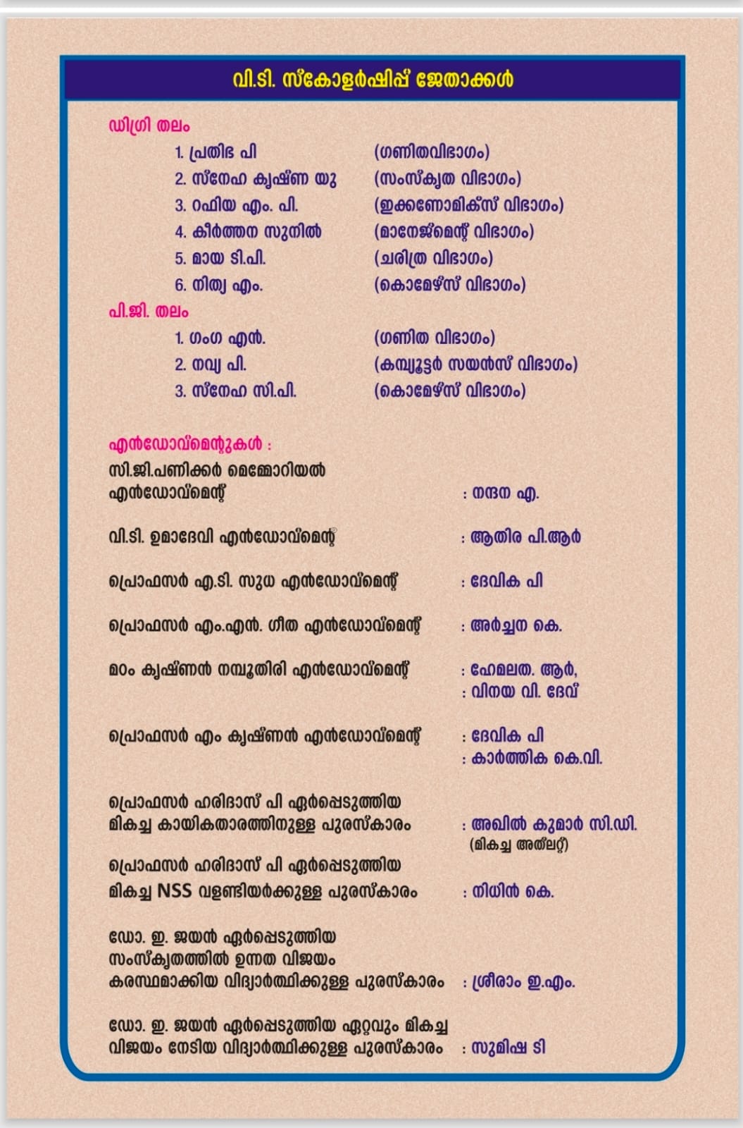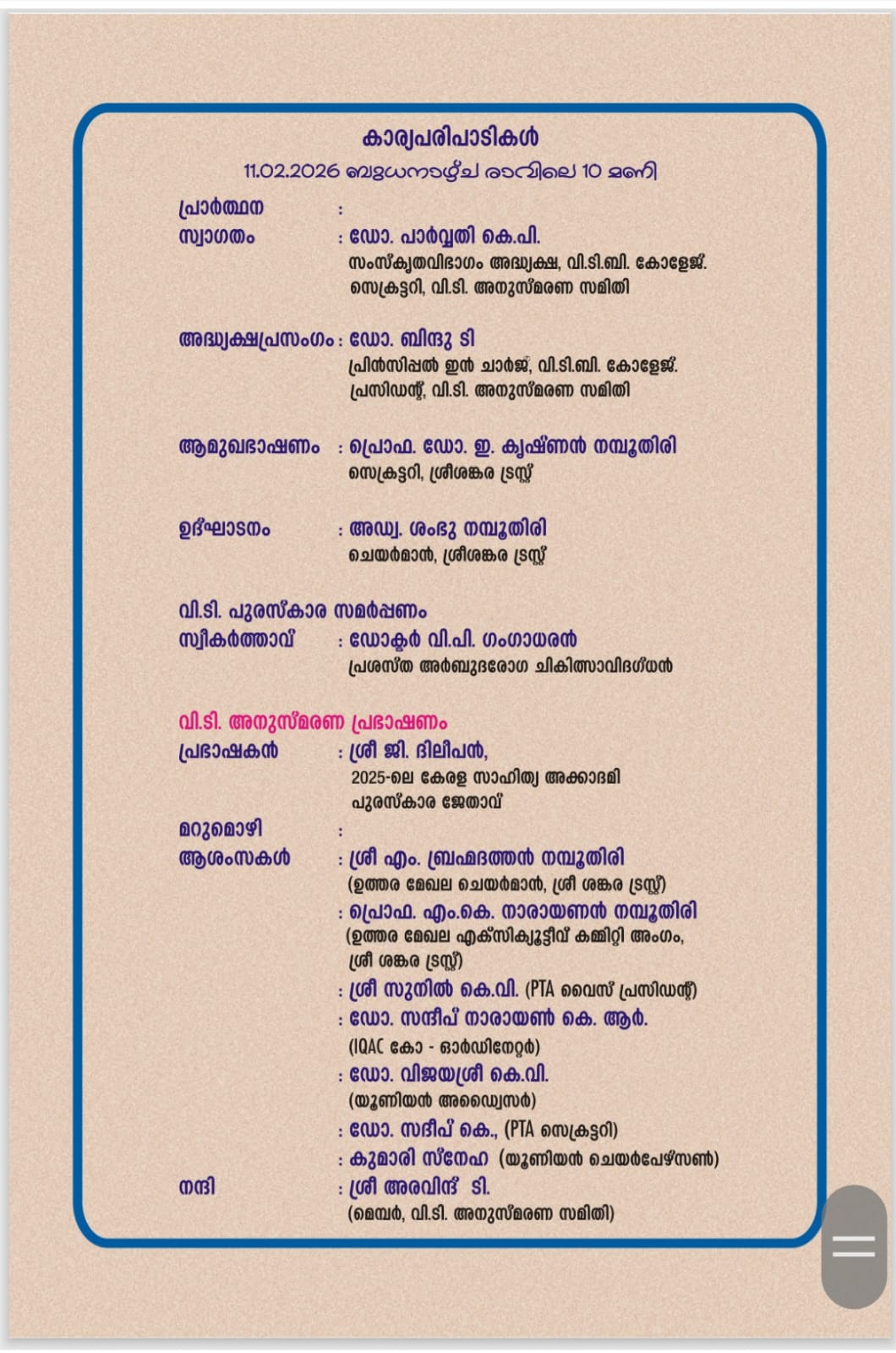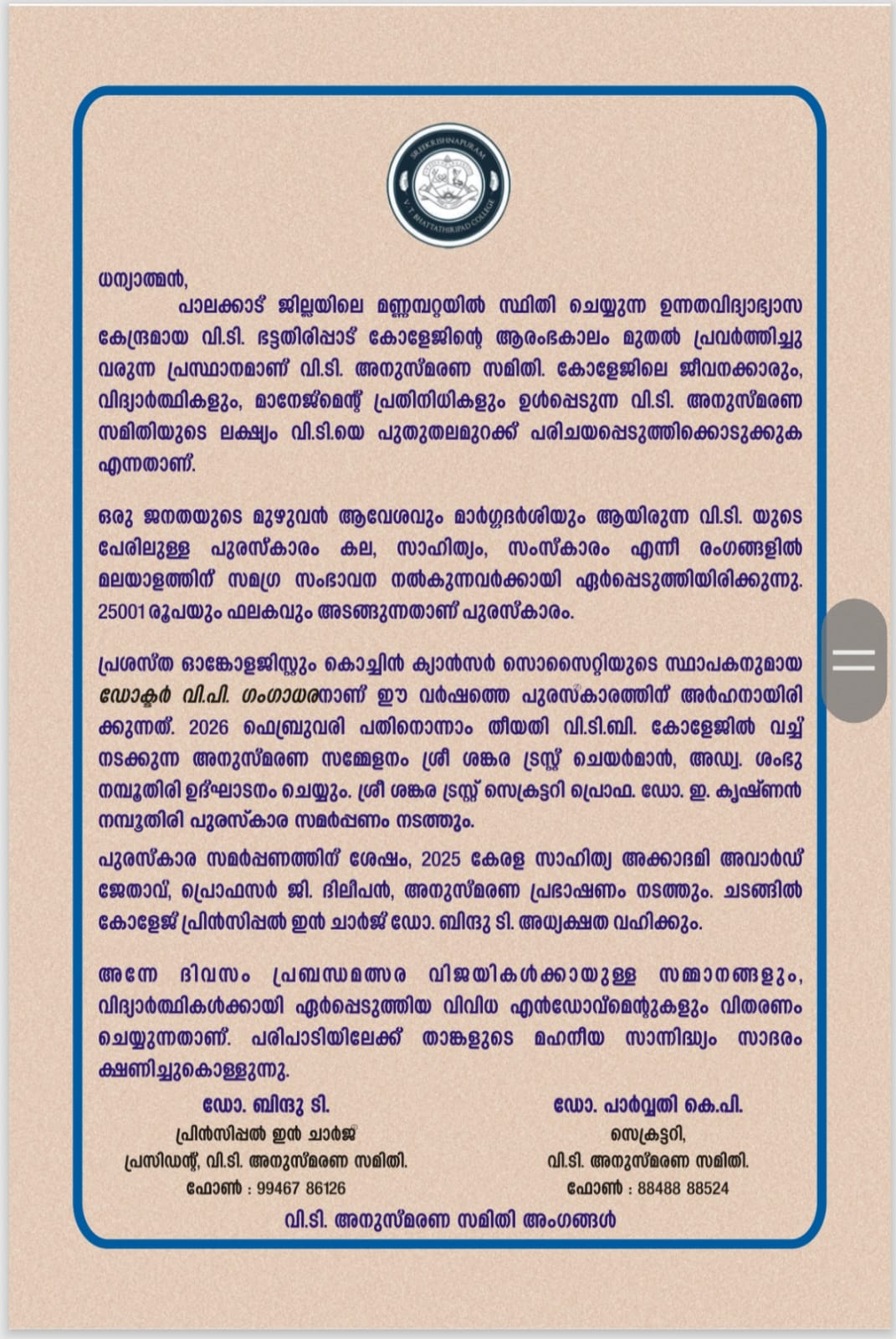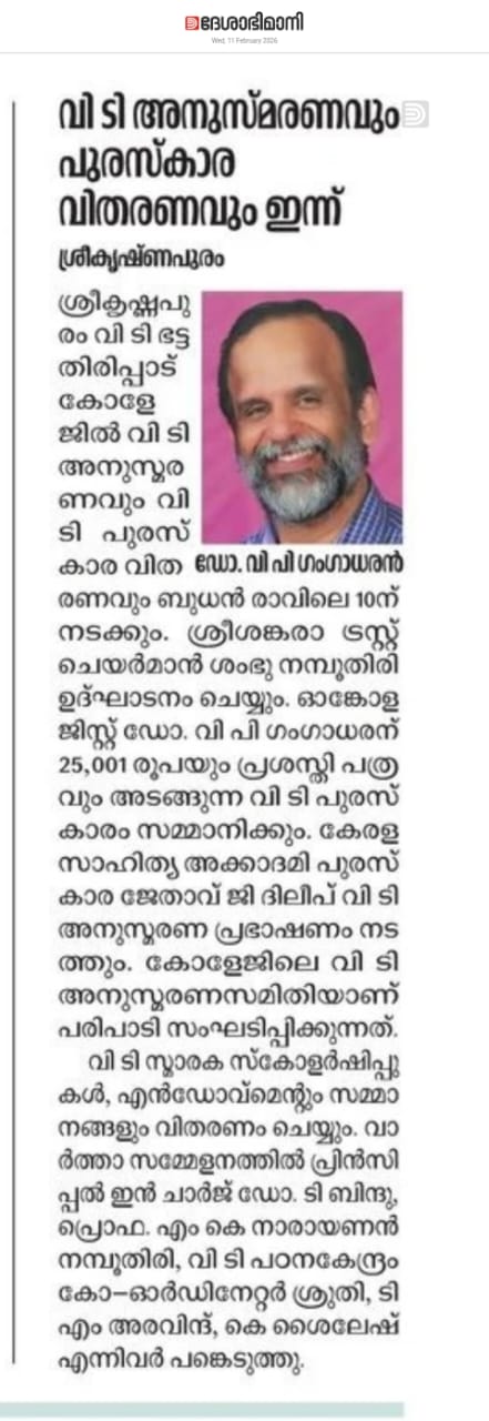"Sreekrishnapuram V.T. Bhattathirippad College is an excellent educational institution where I studied for my BA Degree in Sanskrit. I proudly say that the department of Sanskrit of the college is the most prominent one because of its academic achievement."